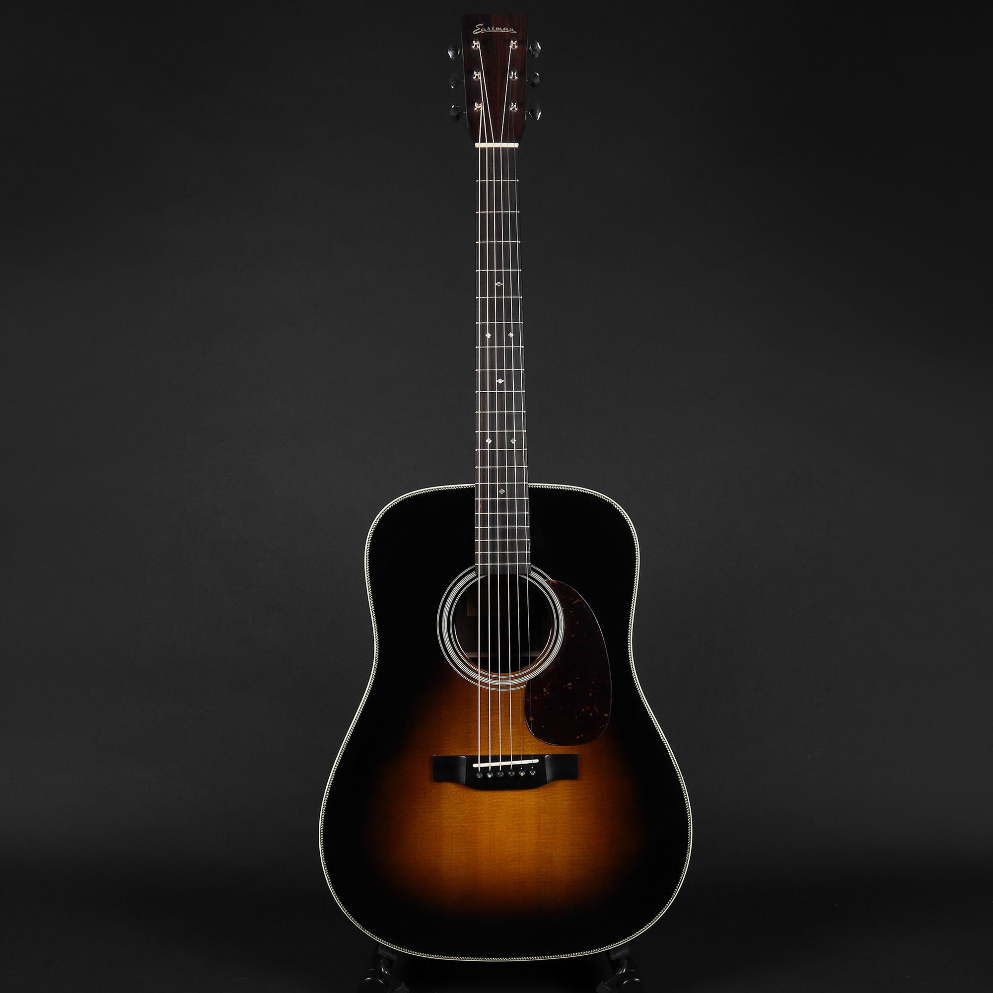 The Eastman E20D‑TC is a beautifully-crafted dreadnought-style acoustic guitar that sits in Eastman’s higher-end traditional series and is built for players who love powerful tone, dynamic response and classic appointments. It features a solid thermo-cured Adirondack spruce top - a process that accelerates the wood’s ageing to give it a rich, lively voice right out of the case, paired with solid rosewood back and sides for deep lows, sparkling trebles and complex overtones that really project. The dreadnought body delivers strong volume and sustain with clear note separation, making it ideal for flatpicking and strumming alike. Add in hand-carved scalloped X-bracing, a comfortable mahogany neck with ebony fingerboard, elegant herringbone binding, abalone snowflake inlays and a fitted hardshell case, and you’ve got an instrument that combines vintage-inspired tone with premium craftsmanship and timeless looks.