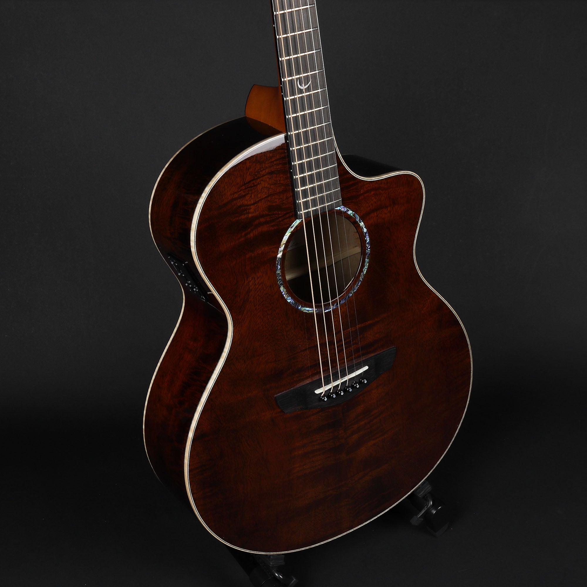 The Dark Natural Gold Neptune FX features a specially mixed deep red-gold finish that lets the natural golden hues and unique grain of all-solid Mango tonewood shine through, ensuring every guitar is truly one of a kind. Inspired by Patrick James Eggle’s celebrated Saluda design, the Neptune’s “Baby-Jumbo” body delivers a powerful, full sound in a more comfortable 16" format, with a cutaway for easy upper-fret access. Java-grown Mango, prized for its lighter tone and tonal balance similar to Mahogany or Koa, is carefully selected for stiffness and resonance, resulting in strong upper-bass response, a rich mid-range, and a warm, rounded top end. Visually striking details include flamed maple binding, stripy ebony fittings and a lustrous golden-red lacquer. Equipped with a Fishman INK3 preamp and undersaddle piezo pickup with 3-band EQ and built-in tuner, the Neptune FX is as versatile on stage as it is distinctive in sound and appearance.