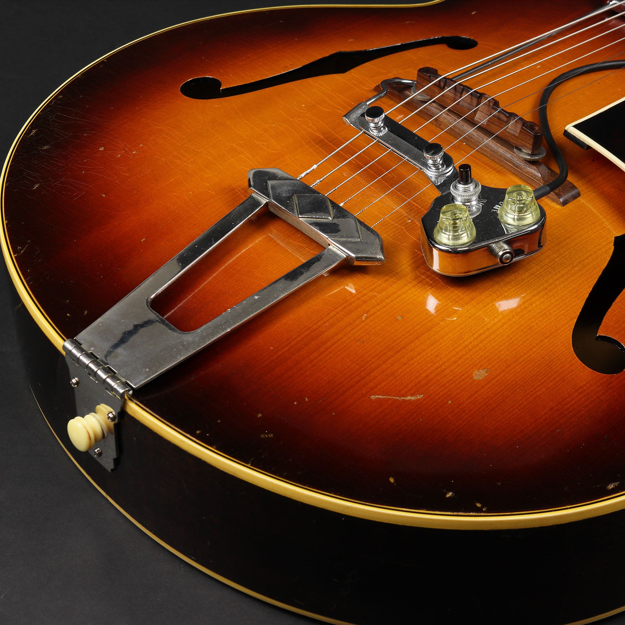 This particular instrument is in very good condition, showing authentic natural wear along the back of the neck. It has had a re-fret and the original tuners have been replaced, though they are included. Fitted with an original DeArmond Rhythm Chief pickup.